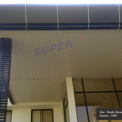The Carrier is fixed with Grid Accessories at the required spacing and has a present location for Panel Sequence. Powder-coated 150F Panels are then easily connected to the carrier. The system has been designed to maximize design flexibility while maintaining ease of installation. 150F, specially designed arrangement make the Ceiling completely interlocked and airtight for a smooth look & uninterrupted appearance, which can withstand extreme wind pressure.Supersil makes 150F interlockable made out of Alu. / GS of 150 mm wide x 17 mm deep x length up to 5 meters. pre-coated with Alu. / GS Carrier of 34.5 mm wide x 48 mm deep x 0 . 6 0 mm thick with protruding ears to hold the panels in a module of 150mm center to center at a distance of a maximum of 900mm to 1 meter.