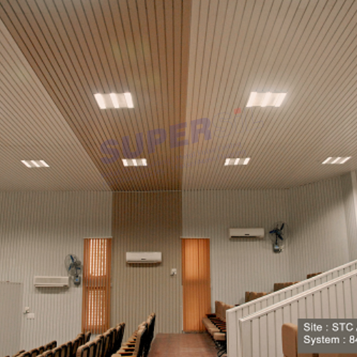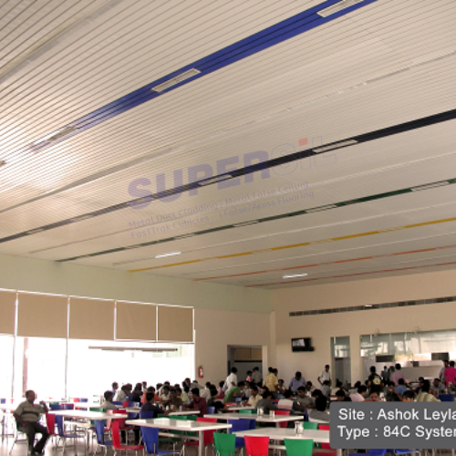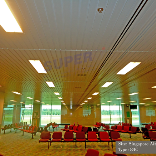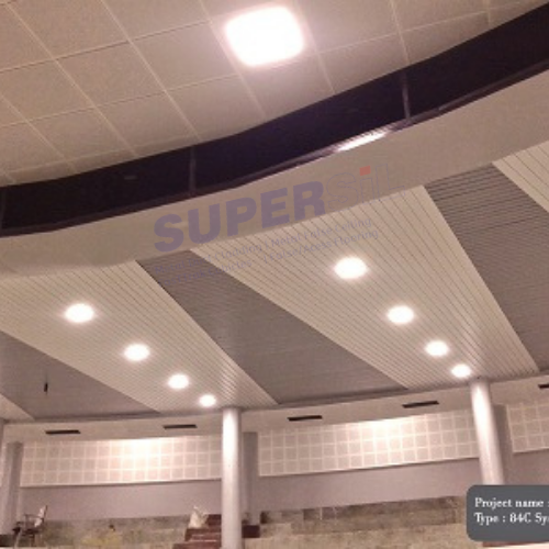 The Carrier is fixed with Grid Accessories at the required spacing and has a present location for Panel Sequence. Powder-coated 84C Panels are then easily connected to the carrier. The system has been designed to maximize design flexibility while maintaining ease of installation.Supersil makes 84C Round edge panels made out of Alu. / GS of 84mm wide x 15 mm deep x length up to 5mtrs. With 25mm recess flange powder Coated in standard colors, fitted on Alu. / GS carrier of 28 mm wide x 43 mm deep x0.45 mm thick with protruding ears to hold the panels in a module of 100 mm center to center at a distance of a maximum of 1.2 to 1.5 meters.