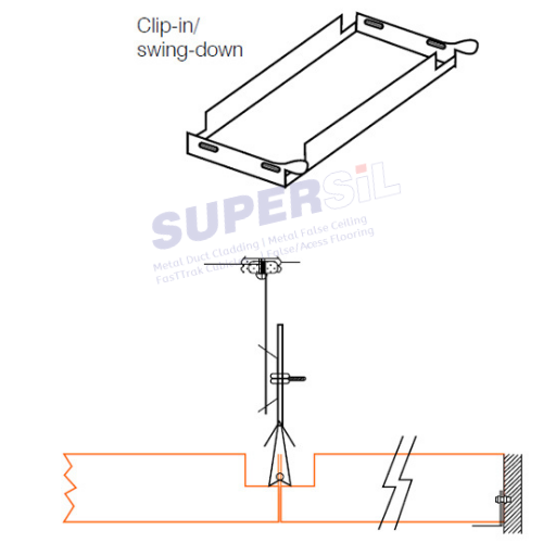 GI rod, top and bottom portion of rod shall be rounded, Top end shall be screwed to slab and bottom shall be nut bolted to hold on hanger. Sil Carrier shall be fixed into hold on hanger with level adjusting spring steel clip to maintain the desired level of False Ceiling. Suspenders shall be at max. 1200 mm and the distance between two carriers will be 1264 mm center to center. Panel shall be snapped into carrier. Pressure clip shall be provided along the length to hold the panels. Edge profile shall be fixed on the perimeter of walls and columns.