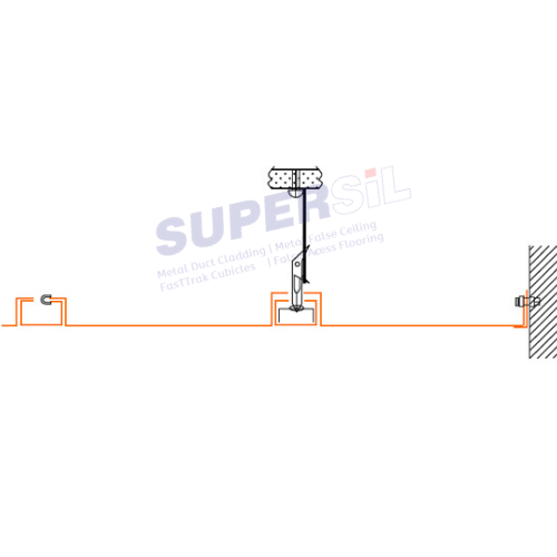 GI rod, top and bottom portion of rod shall be rounded, Top end shall be screwed to slab and bottom shall be nut bolted to hold on hanger. Sil Carrier shall be fixed into hold on hanger with level adjusting spring steel clip to maintain the desired level of False Ceiling. Suspenders shall be at max. 1200 mm and the distance between two carriers will be 1249 mm center to center. Panel shall be snapped into carrier. Pressure clip shall be provided along the length to hold the panels. Edge profile shall be fixed on the perimeter of walls and columns.